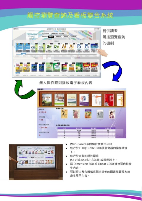 觸控瀏覽查詢及看板雙合系統 提供讀者 觸控瀏覽查詢 的機制 無人操作時則播放電子看板內容 • Web-Based 版的整合性展示平台 • 執行於 FHD(1920x1080)及瀏覽器的操作環境 下。 • 執行於大型的觸控電視 (55 吋或 65 吋左右為佳)或顯示器上。 • 與 Dimension 800 或 Linear C900 連接可自動產 生內容。 • 可以經由整合轉檔來配合其他的圖書館管理系統 產生展示內容。