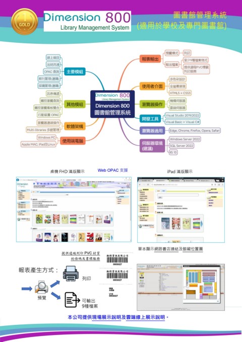 桌機 FHD 滿版顯示 Web OPAC 支援 iPad 滿版顯示 單本顯示網路書店連結及館藏位置圖 提供遠端列印 PVC 材質 的條碼及書標服務 本公司提供現場展示說明及雲端線上展示說明。